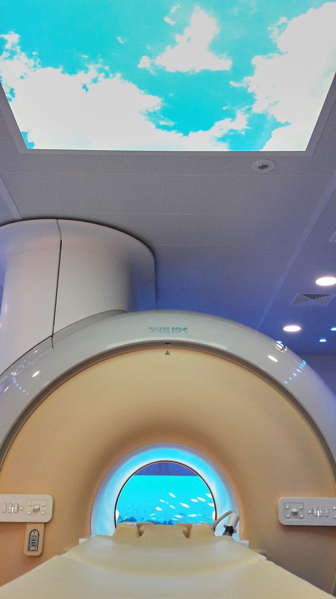 Wir bieten Ihnen eine innovative und einzigartige Lösung für dieses Dilemma. Mit einem virtuellen Dachfenster und dem neuesten Entertainmentsystem nehmen wir Ihnen die Angst vor der Enge des Raumes wobei die Röhre bereits einen komfortablen Durchmesser von 70cm aufweist. Während der Untersuchung wird Ihnen jederzeit der Fortschritt der Untersuchung in Echtzeit angezeigt. Außerdem können Sie eines von vielen Unterhaltungsprogrammen auswählen, das während der Untersuchung für Sie eingespielt werden soll.